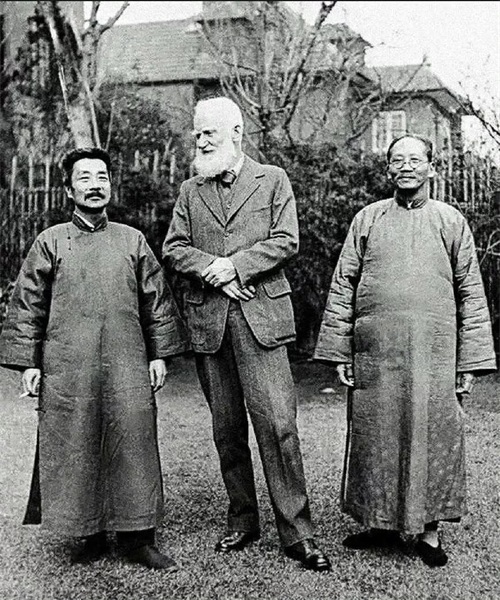 (萧伯纳与可爱的鲁迅先生和蔡元培合影)