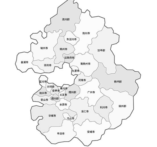 现在的韩国京畿道具体划分,看着中间这么一个空白区域就是首都首尔和仁川,被挖空了。