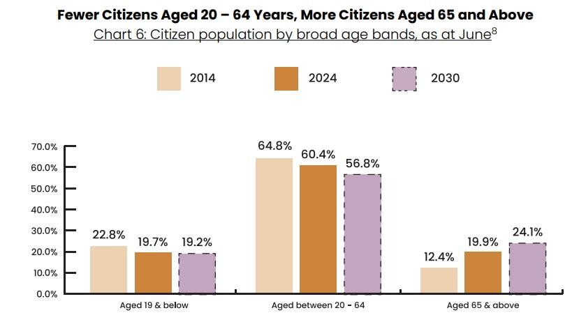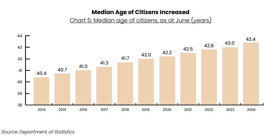 2024年,新加坡公民的年龄中位数为43.4岁,而2014年这一数字为40.4岁,每年都在增长。
