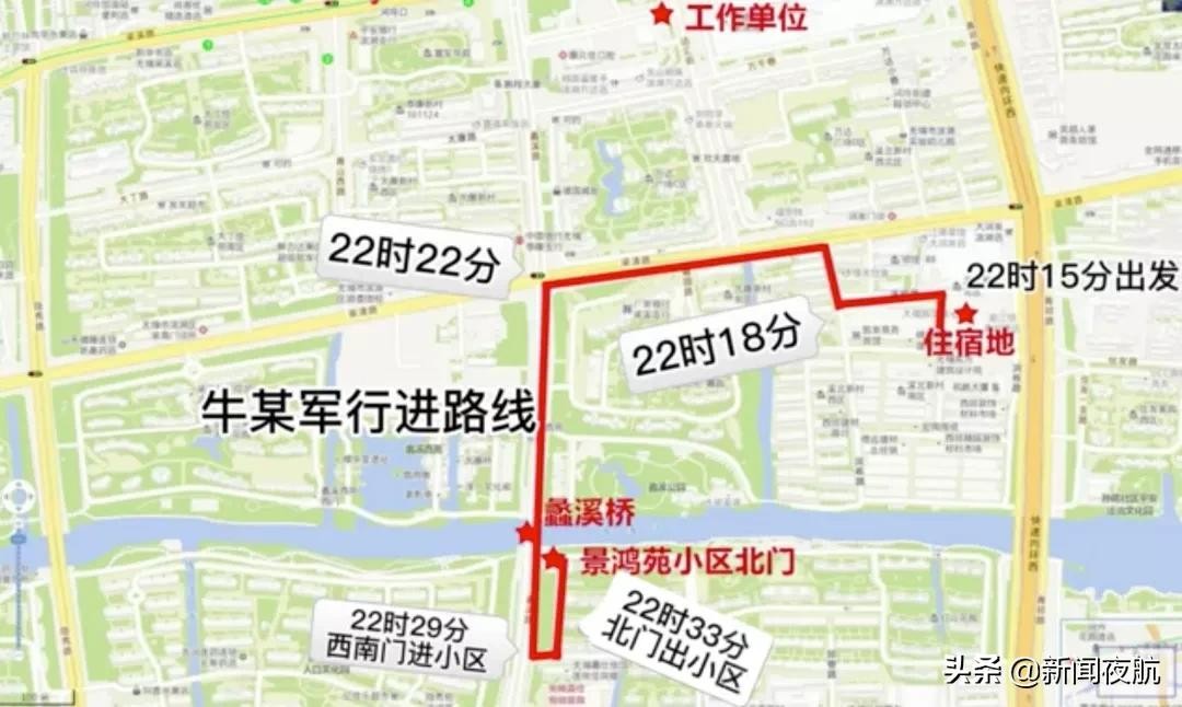 22时18分,牛某军经过溪北新村;22时22分,在梁清路蠡溪路口过人行道;22时29分,进入景鸿苑西门;