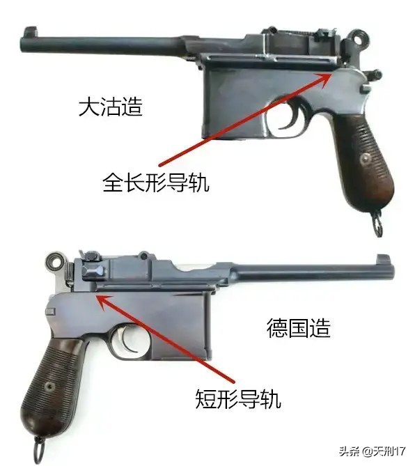 不仅如此,这大沽厂仿制的大镜面,还专门进行了改进。这真正的德国进口大镜面匣子,为了减重都是不满槽的。而大沽厂却独辟蹊径,专门把加强筋延伸到了枪体尾部,特地增加重量弄出了一种“满槽大镜面”,成为区别于德国原装货的最大特征。那么,大沽厂为啥要这样改呢?