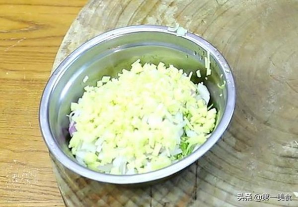 再准备一小块肥肉,也切成碎粒放在一起备用,这里五花肉主要用来增香,不能抢了牛肉的味道,这里肥肉的用量要比瘦肉多一点。