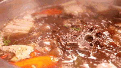 享受完羊蝎子之后,下一步便可以开始涮菜了,大白菜叶煮完,外头裹着油,里面透着汤;炸腐竹煮完,筋道里渗着肉汤的香;嫩豆腐煮完,卤香气活像是豆腐本来就有的,咬一口从里往外冒着肉汤……