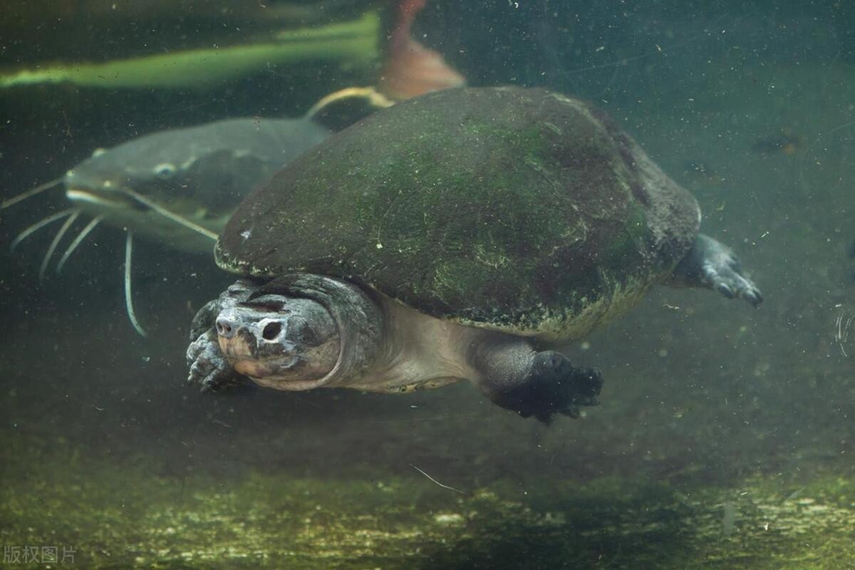 马来西亚巨龟算是一种体型较大的深水龟,它们能够在较深的水域中自由游动并潜水觅食。从其脚掌的蹼就能看出,这种龟擅长游泳。所以可以采用家养深水饲养。