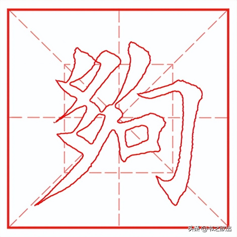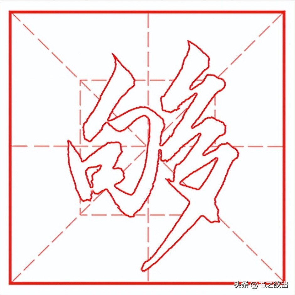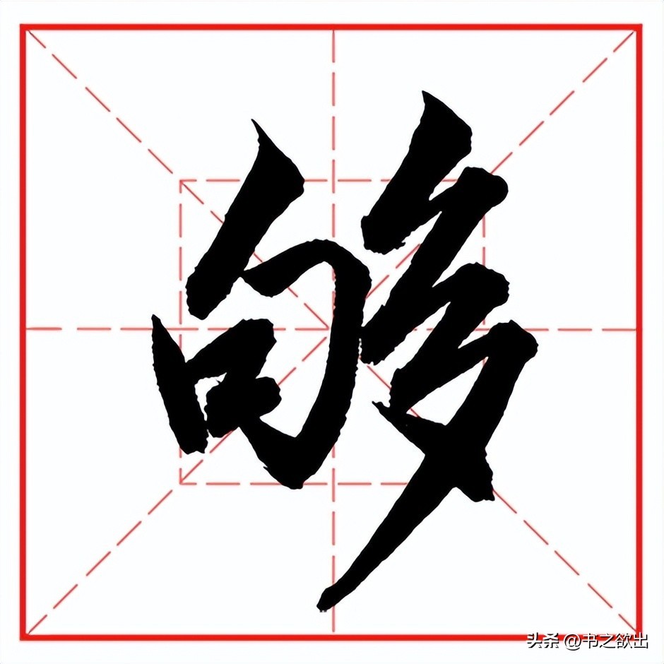 左边“多”字以斜取势,斜而不倒。首撇以斜切落笔,落笔后随即转锋向左下方快速提锋撇出,短促有力;横撇起笔位于首撇的转折处,横画一带而过,然后提锋顿笔向左下行写撇,撇身角度稍直,注意长度;点笔位于首撇的尾部,略平,收笔藏于第二撇;下面小撇与第二个撇画虚接起笔,勿长勿重;横撇横画一带而过,然后提锋顿笔向左下行写撇,撇笔舒展,注意行笔的轻重变化,收笔力达撇尖,并且四个撇笔的指向各不相同;最后点笔写法与上点类似。
