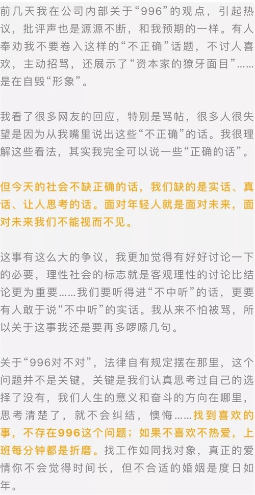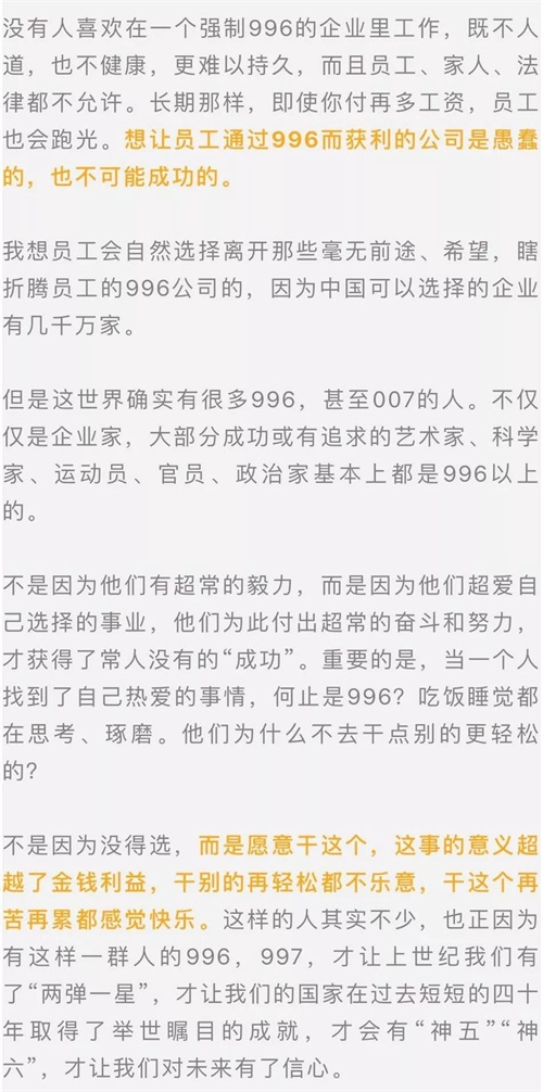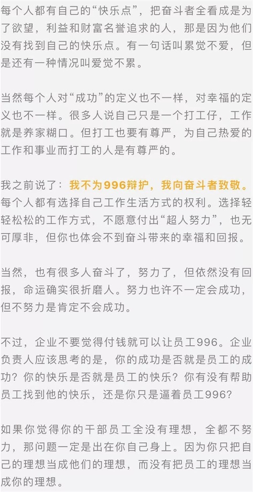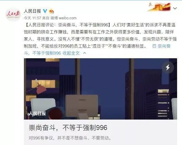昨天,人民日报评论部发布文章《崇尚奋斗,不等于强制996》,文章认为,我们的企业不仅要依靠员工的汗水,更要激发员工的灵感;不仅要让员工更努力的工作,更要激发员工更高效的工作;不仅要靠加班工资的激励,更要让家人的陪伴、身体的健康、意义的饱满也成为工作的奖赏。