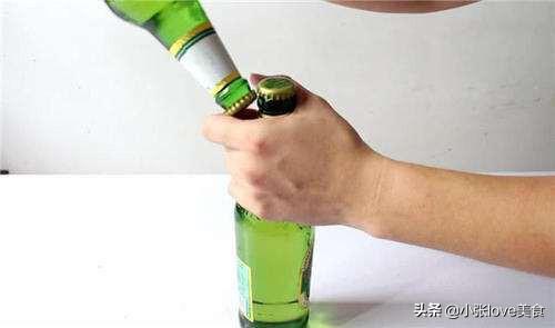 2.先准备两瓶啤酒,一瓶放在桌子上,然后,另一个啤酒瓶放在右手上,方向倾斜,让下面的酒瓶盖正好抵住上面酒瓶盖上。这时将两个酒瓶往下梦的一使劲,下面的酒瓶就将上面的酒瓶盖冲掉了。上面的啤酒盖轻松被打开,动作熟练的人,用这个方法,一秒钟就可以开啤酒了。