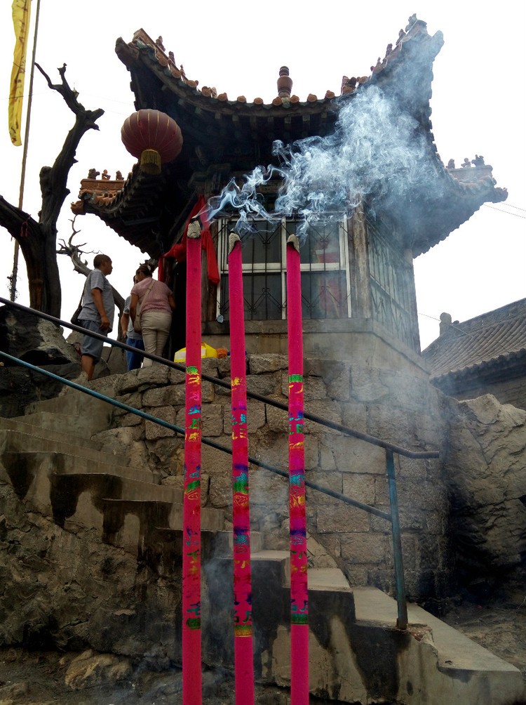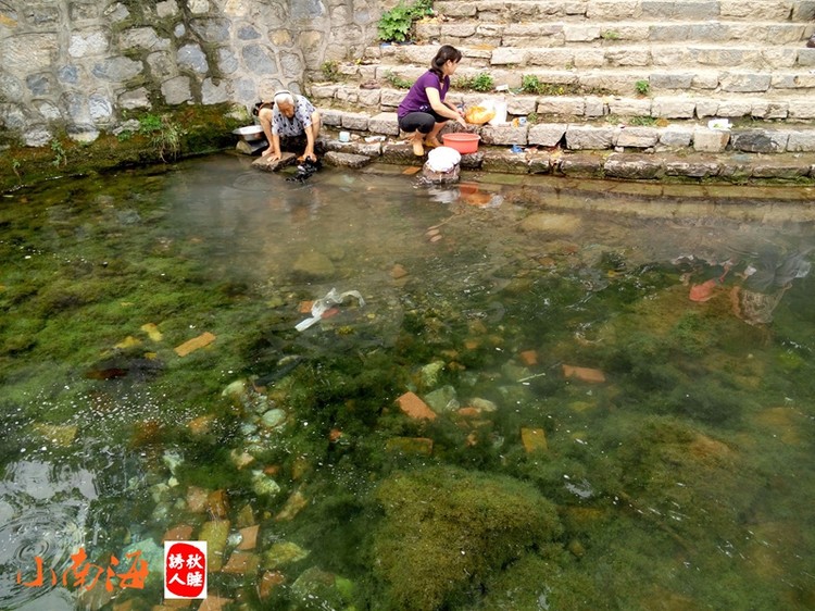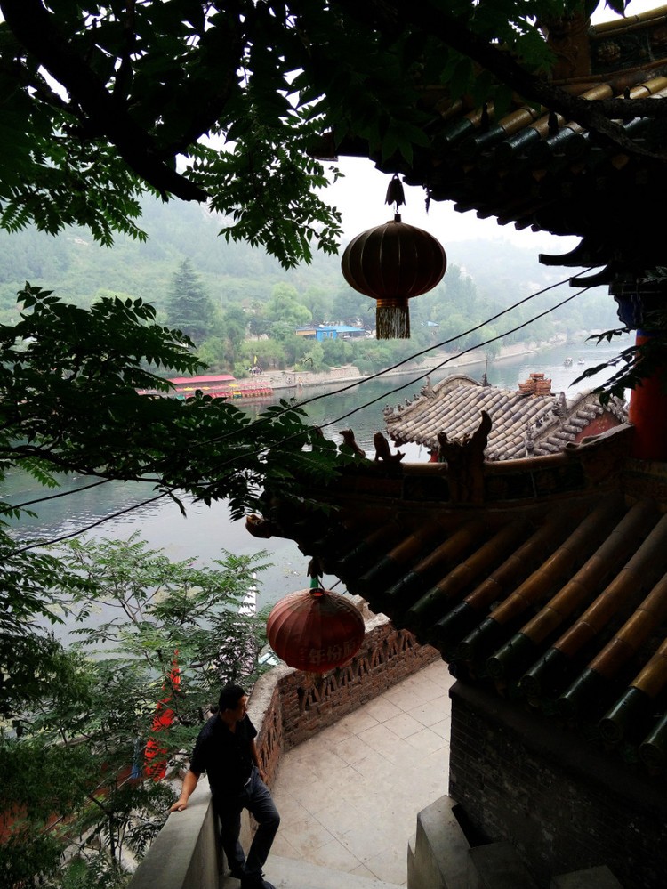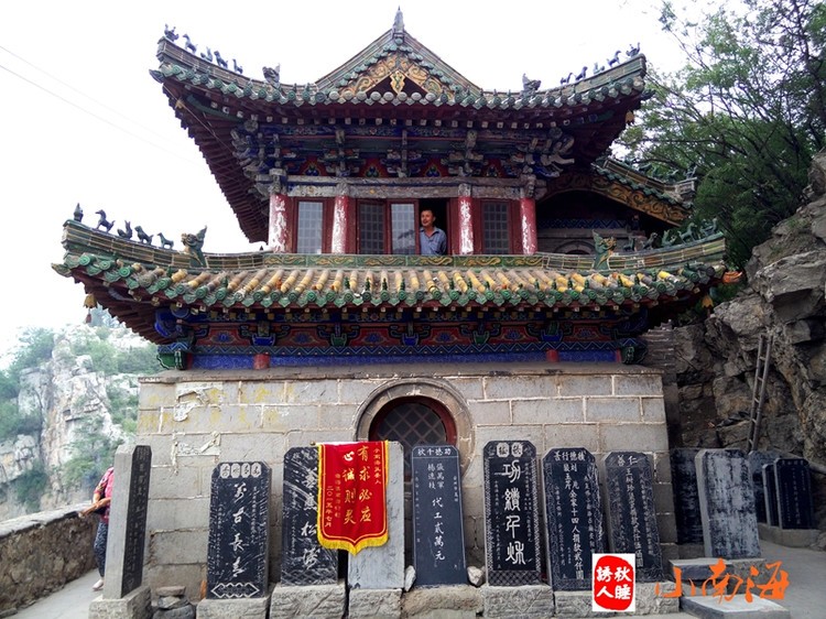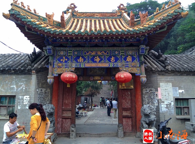 小南海南侧牛头山北麓,南海古庙座落于山水之间。古庙始建于唐,是道教胜地。由西至东依次为山门、灵官殿、佛殿、碧霞祠、圣人阁、道房,一字排开,楼阁雄秀。青砖灰瓦,道房古朴。柏林凝翠,花红卉青,道院清幽。圣人阁平面方形,面阔进深3间,房架由28根木柱承托,檐部斗拱密布,角檐翘挑凌空欲飞,黄绿琉璃瓦盖顶,金碧辉煌,下层有木梯可通上层,阁上供孔子像。碧霞祠面阔3间,上下2层,高10米,悬山顶式,顶盖绿琉璃瓦,沿石梯登上,远天长水尽收眼底。