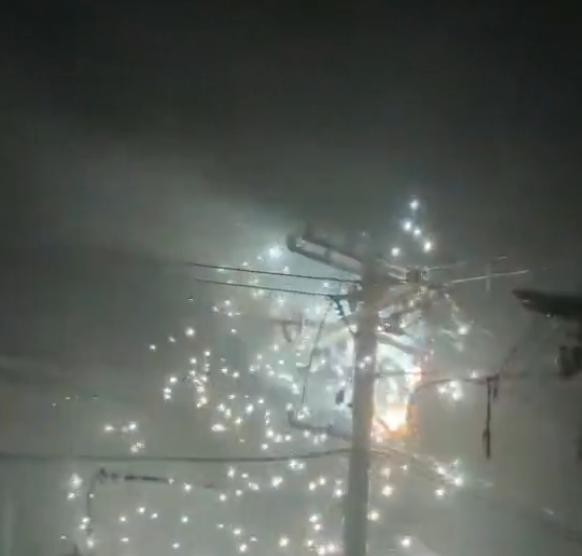 视频中,电线杆顶部燃起明火,时而火星四射犹如燃放烟花,事发时天空正下着下雨,整个过程持续了30秒左右。