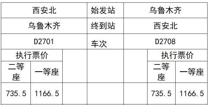 D2701次于10月12日起开行,8时从西安北站开车,当日21时15分抵达乌鲁木齐站,全程运行时间13小时15分钟。