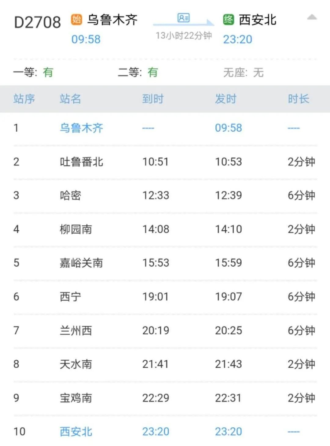 D2708次于10月11日起开行,乌鲁木齐站9时58分开车,当日23时20分抵达西安北站,全程运行时间13小时22分钟。