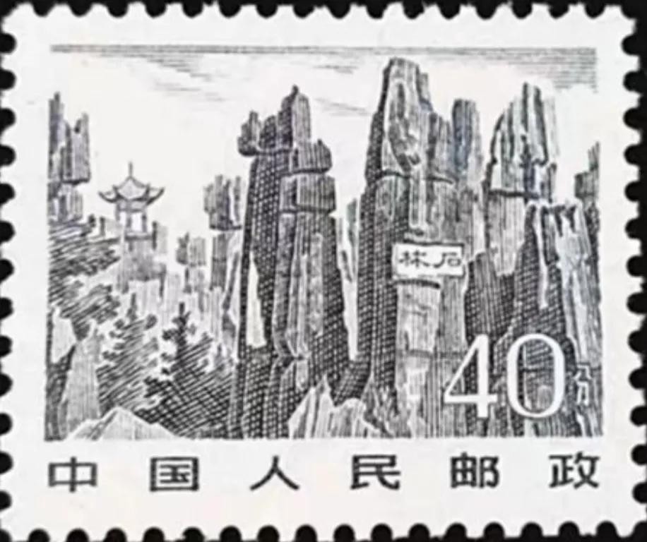 石林40分面值普票,选取最负盛名的“石林胜景”为主画面,以灰黑色为主色调,彰显了石林的险峻之美。