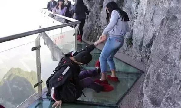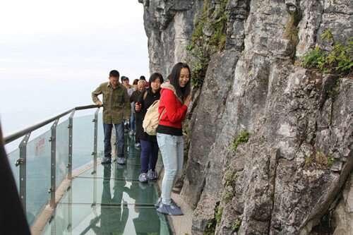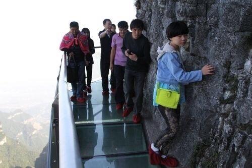 让游客最有挑战性景点就是张家界盘龙玻璃栈道,虽然长度只有60米,是全国所有景区最早一条高空玻璃栈道,(如今你在全国所有景区看到玻璃栈道都是张家界玻璃栈道走红之后,借鉴开发、如今才遍地开花)张家界玻璃栈道经常让游客胆战心惊,嘶声力竭的尖叫,魂不守舍,常常看到一些胆小男性游客在玻璃栈道上趴着走,一些游客靠边扶墙、就把这类游客叫扶墙族,这个玻璃栈道不另外收费,278元门票是包含全部景点,由于玻璃栈道需要防滑鞋才能上,景区提供5元一个鞋套,即防滑又环保卫生。