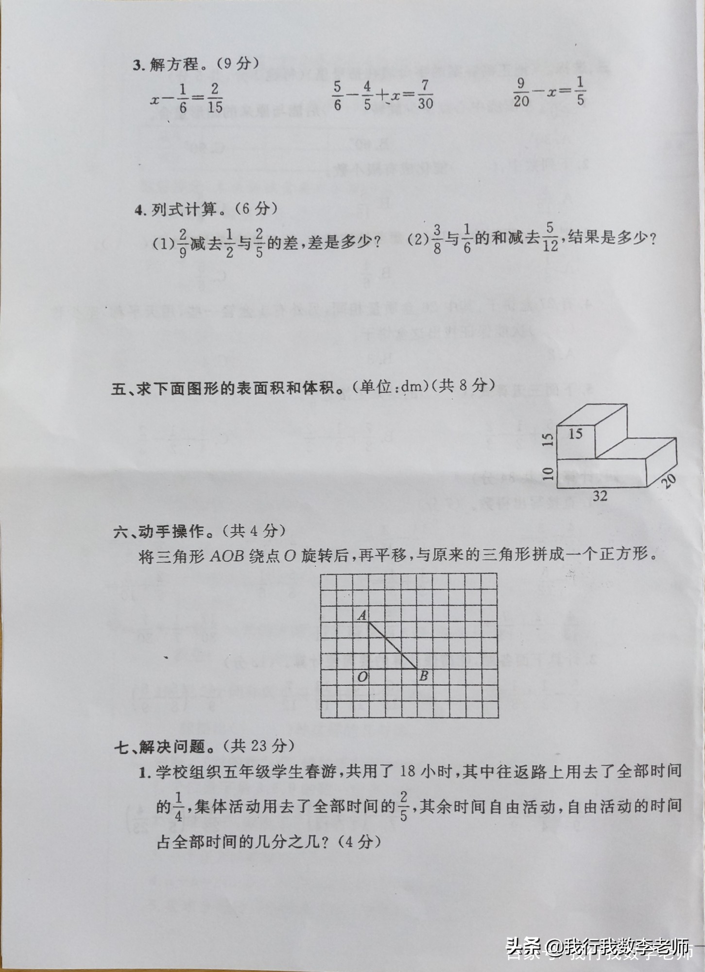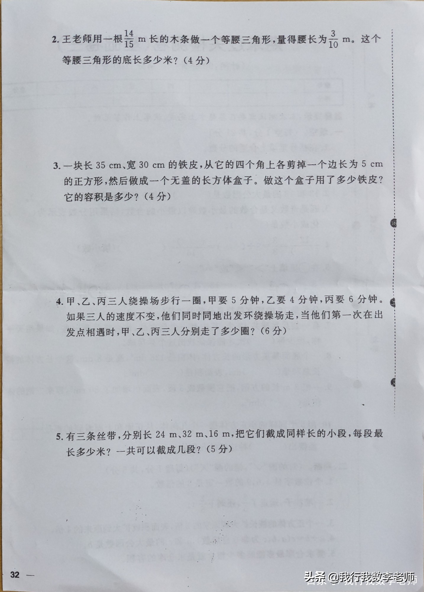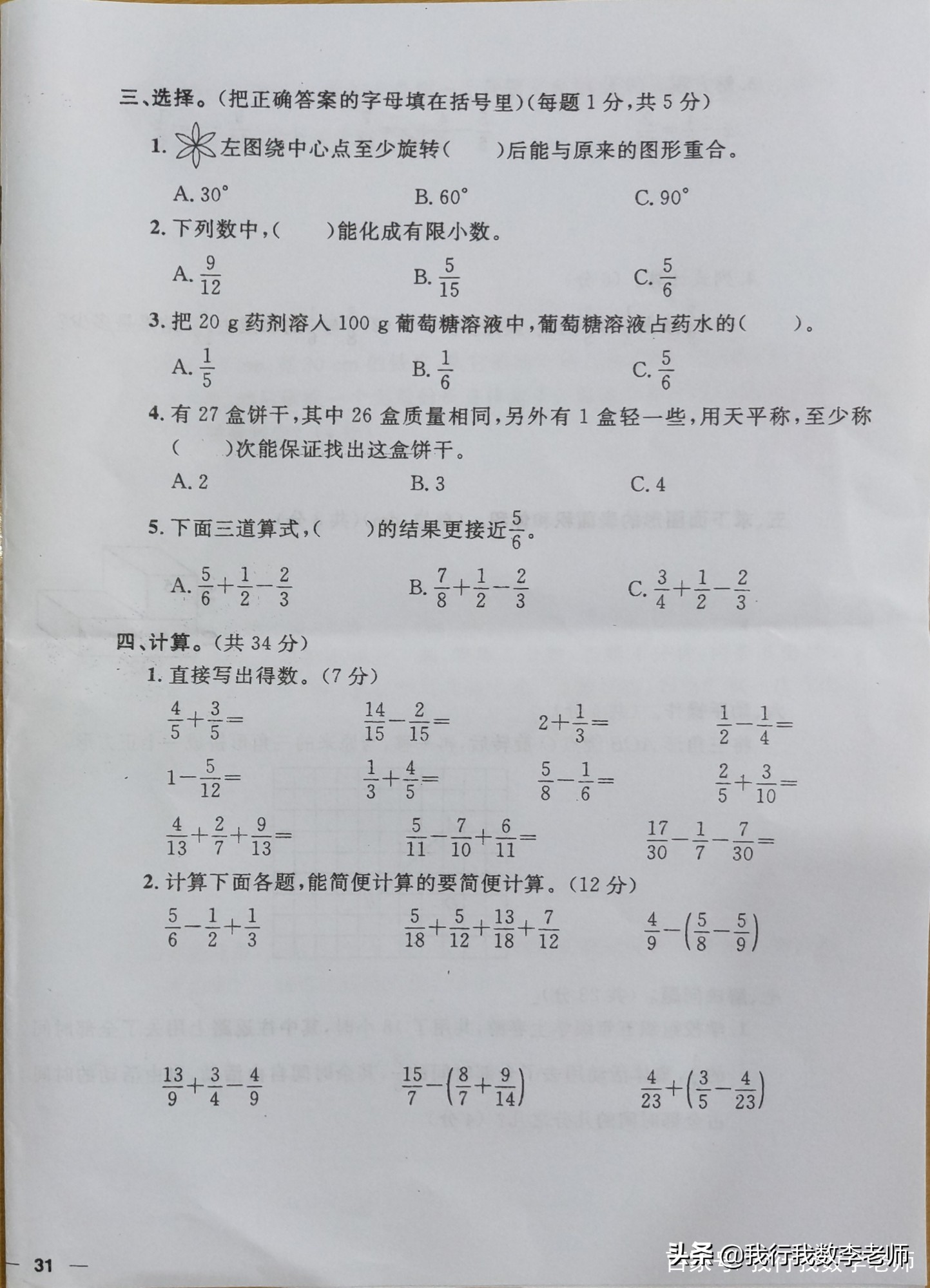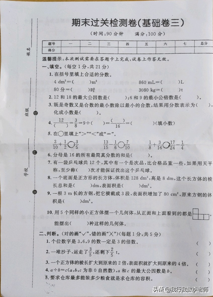 此外,本学期的因数和倍数、表面积和体积也是重难点内容。喝牛奶问题由于还未学习分数乘法,学生理解起来十分困难,打电话问题、找次品考试时题量不多,也是难点。来看看这张试卷考查了哪些知识点,你能轻松应对吗?