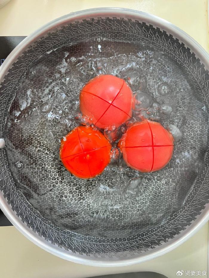 在此期间,处理番茄,先在番茄上划上十字刀纹,然后将其放入沸水中烫一段时间。烫过后,番茄的皮容易剥离,切块备用。