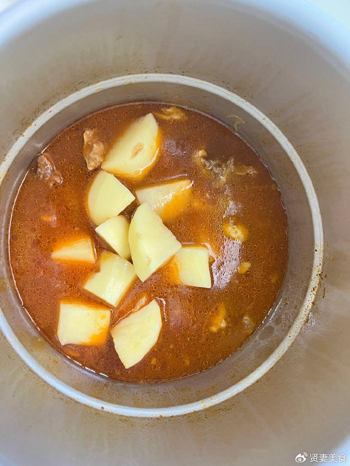 30分钟后,将多余的调味料捞出,这样可以保留汤汁,用于后续的拌饭或拌面,为食材增添更多美味。将切好的土豆块放入高压锅中,继续炖煮约12分钟,直至土豆变得软糯可口。