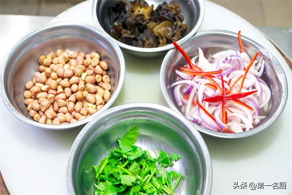具体做法:1.准备花生米150克备用,洋葱半个切成条,用手抓散,红椒半个去瓤,切成长条,香菜一小把切成段,一起放入盆中,泡好的木耳一小把,把大的切成小片,也装入盆中备用。