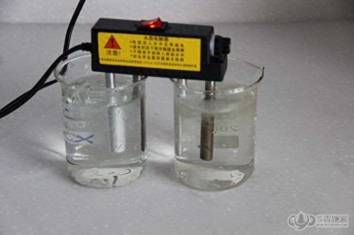 2、准备检验--将电解器一端放进一个玻璃杯内,插上220伏电源,再将另一端闲置,一定要放置在空气中,也不要用手碰。