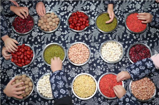 清代《日下旧闻考》载“十二月八日赐百官粥”,富察敦崇《燕京岁时记》中详细记载了当时北京的腊八粥:“腊八粥者,用黄米、白米、江米、小米、菱角米、栗子、红江豆、去皮枣泥等,合水煮熟,外用染红桃仁、杏仁、瓜子、花生、榛穰、松子,及白糖、红糖、琐琐葡萄,以作点染。切不可用莲子、扁豆、薏米、桂元,用则伤味。每至腊七日,则剥果涤器,终夜经营,至天明时则粥熟矣。除祀先供佛外,分馈亲友,不得过午,并用红枣、桃仁等制成狮子、小儿等类,以见巧思。”可见,明清时期喝腊八粥早已成为深入人心的百姓风俗。