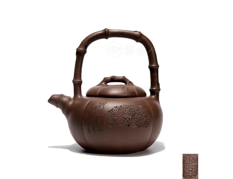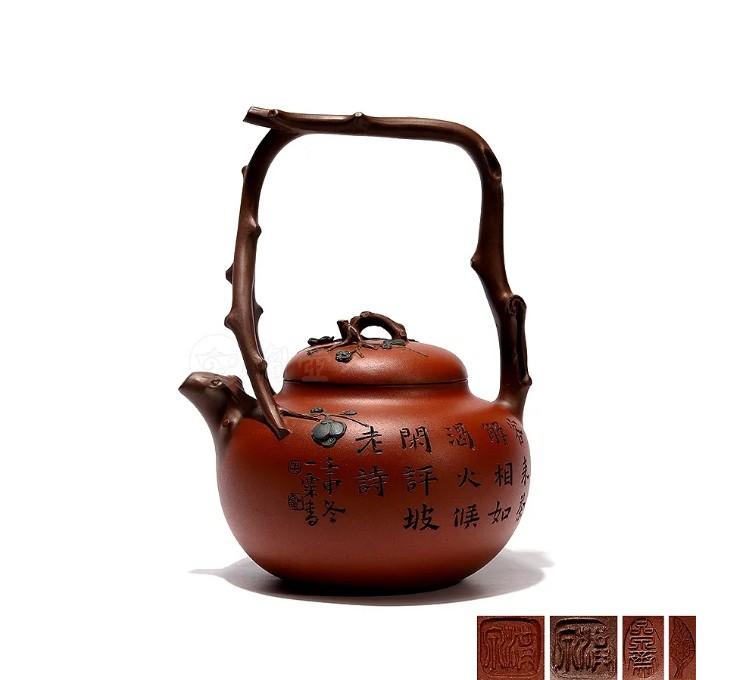 ,书画与紫砂相结合,极富传统文化底蕴。原一厂小红泥胎质细腻,泥色明润。壶身饱满,呈扁球状。提梁及流、钮均塑以枝干造型,形态自然拙趣,颇有古韵清流之感。
