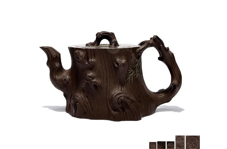 以一厂老紫泥作胎,用墨绿泥点缀柏枝,型制古穆,色泽深沉。以柏入壶,结节苍劲,纹理清晰,肌理丰富,抚摸光润。