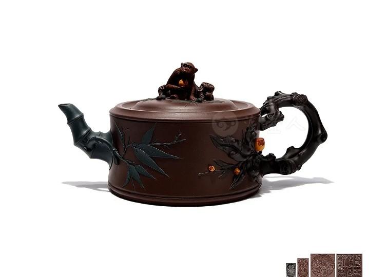 整壶以灵猴献桃为主题,将松、桃、竹、猴、松鼠等元素融为一体,1100CC的大品,成型工艺难度极大,细节均细腻逼真。