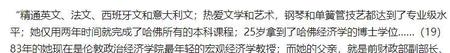 “精通英文、法文、西班牙文和意大利文;热爱文学和艺术,钢琴和单簧管技艺都达到了专业级水平;她仅用两年时间就完成了哈佛所有的本科课程;25岁拿到了哈佛经济学的博士学位……(19)83年的她现在是伦敦政治经济学院最年轻的宏观经济学教授;而她的父亲,就是前财政部副部长、前中金公司董事长、现亚投行掌门人——金立群”。
