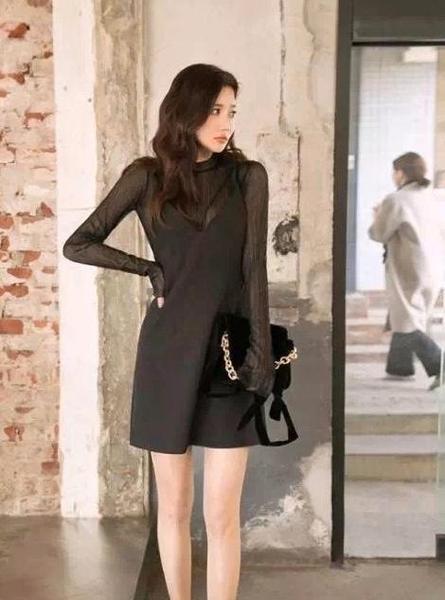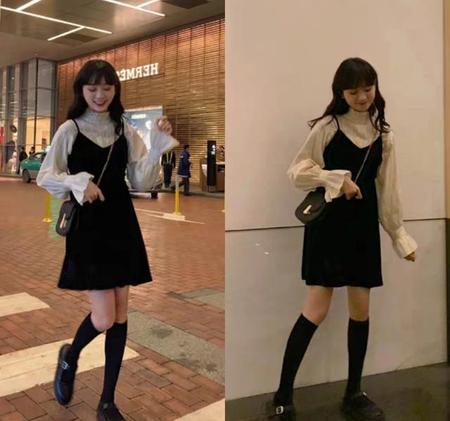 黑色吊带裙这样搭配也很好看,利用一件白色蕾丝打底衫搭配黑色吊带,相对比上面这套,这套搭配会显得更加的甜美可爱一些,特别适合甜系少女们。