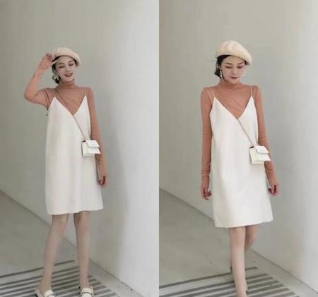 偏爱成熟风的小仙女们可以参考这套搭配哦。简单的白色吊带连衣裙内搭一件浅粉色的高领打底衫,简约又大气,舒适大方。