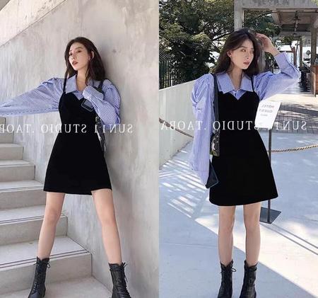 我们先来看看吊带裙怎么搭配好看吧。吊带裙的实用性很强,不同穿搭可以演绎出不同风格。追求时尚个性的小仙女们可以参考这套搭配,黑色收腰吊带连衣裙内搭一件泡泡袖的条纹衬衫,时髦又好看。