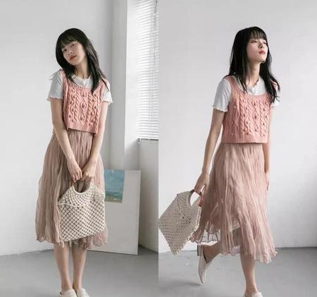 除了吊带裙,吊带上衣也可以选择哦。吊带上衣怎么穿好看呢?参考这套搭配,粉色的吊带上衣内搭一件白色T恤,下身再搭配一条粉色百褶纱裙,可爱又少女。
