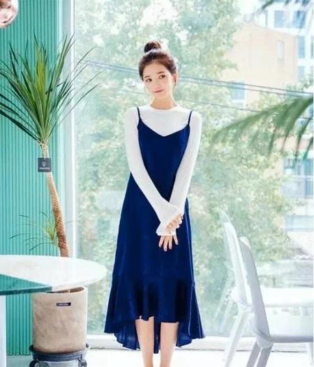 吊带连衣裙内搭白色T恤是最常见的穿法,百搭的白色T恤带给你舒适的同时也不会抢了吊带连衣裙的风头,作为配角来烘托住主角的魅力。