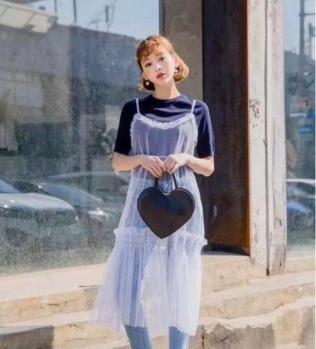 吊带连衣裙内搭短袖T恤,更具有街头范儿。完全颠覆了吊带连衣裙原有的性感味道,混搭各种运动鞋更是吸引眼球哦。