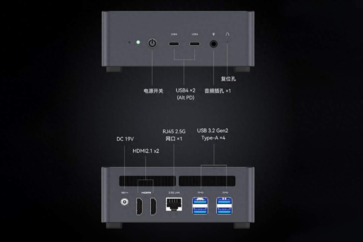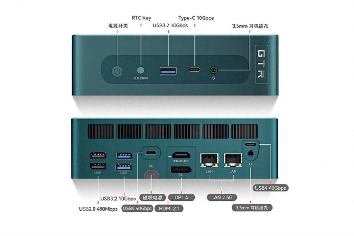 对比一下设计尤其是扩展接口不难发现,零刻GTR7这个尺寸是一丁点都没浪费。首先零刻GTR7把传统的圆孔电源变成了放置在机身底部的磁吸电源。其次是接口规模上,USB接口比铭凡UM790 Pro多了,USB4 Type-C也多了一个,视频部分提供了HDMI2.1和DP1.4两种选择,还有它提供了双2.5Gbps网线接口。