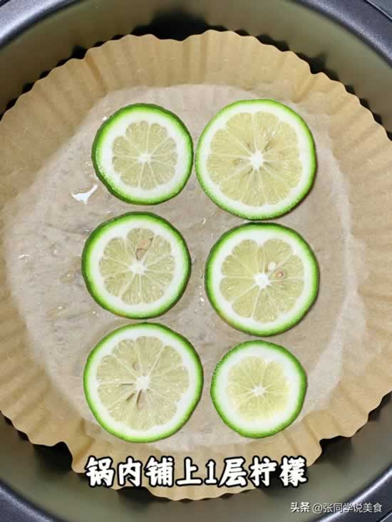 4、空气锅内放入一张烤纸,然后铺上一层柠檬片,如下图所示。