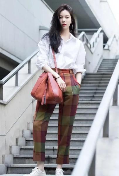 这套是典型的运用了“上身下浅”的穿搭原则,暗沉的格子裤不免有点老气,用白衬衫来搭配就刚刚好,瞬间将格子裤的气质拉高好几个Level,脚上选择白鞋,与衬衫相呼应,圆形大耳饰超有范,穿这身逛街,不用怀疑时尚达人就是你了。