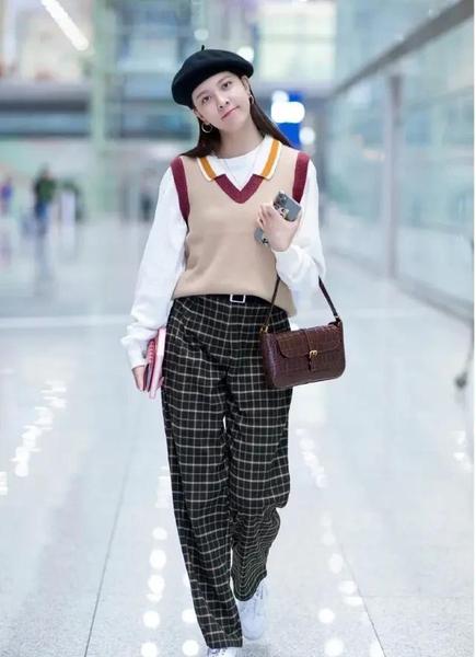 卡其色的英伦风毛衣背心搭配领口和肩部采用较复古的暗红色,整体突出典雅的艺术气息,黑白格子裤超吸睛,气质感十足,搭配黑色贝雷帽,学院风满满。