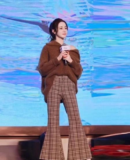 个人非常喜欢热巴的这套格子穿搭。棕色的廓形毛衣,慵懒又温柔,露出一点小香肩,妩媚撩人,下身的格子裤有点微喇的设计,毛衣下摆扎进裤腰里,随性又时尚,搭配高跟鞋,分分钟凹出逆天大长腿,整身设计充满浓浓的复古气息。