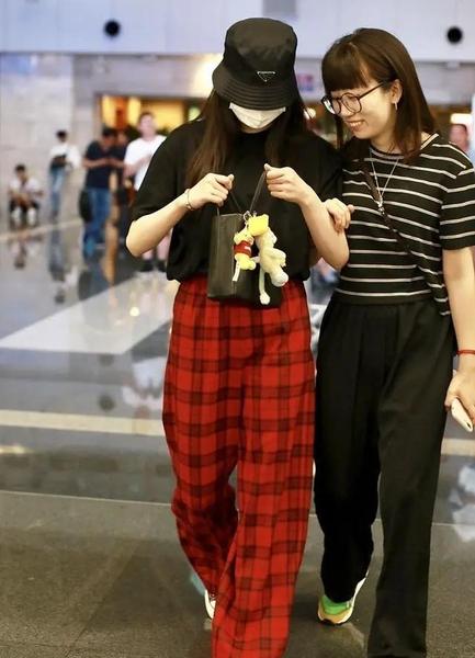黑色T恤暗沉,红黑格子裤亮眼,帆布鞋休闲,配上黑色渔夫帽,整体看起来又潮又休闲,人群中最亮眼的一抹色彩。