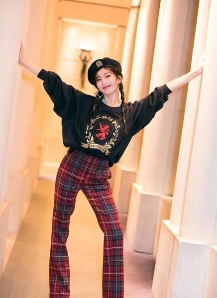 舒适的黑色宽松卫衣,随意的图案却又不失时尚感,将卫衣的衣角塞进红色格子裤里,完美的展示身材比例,搭配高跟鞋大长腿显露无疑,让人羡慕,头戴黑色贝雷帽,两股辫子显得整体风格活泼可爱,搭配夸张耳环,俏皮感十足,比较休闲的一身,却完美展示出好身材。