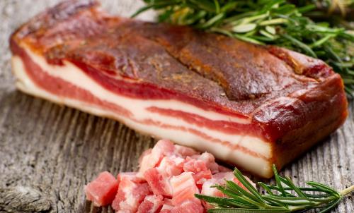 4、定盐:腌肉可堆放在-5℃冷库保藏,也可浸没在24~25度的盐水中。若出现盐水混浊和异味时,说明盐卤变质,必须将盐卤重新煮沸后再用。 工艺提示:因为需要炸制,所以要预备熟菜油1000克,实耗约200克。