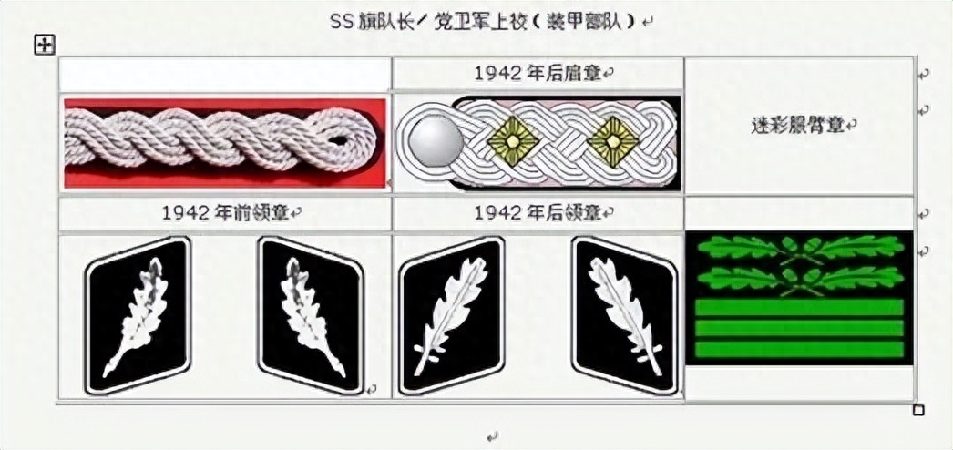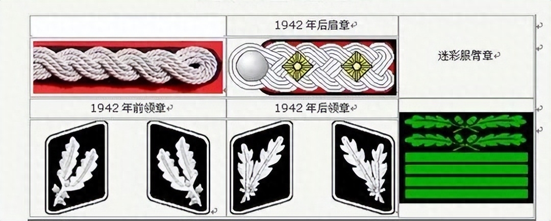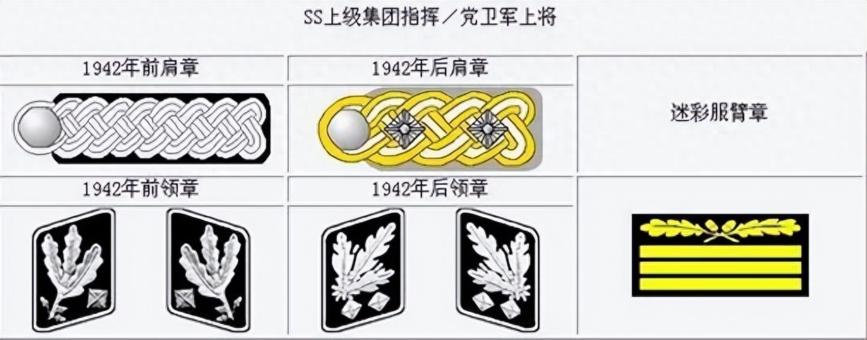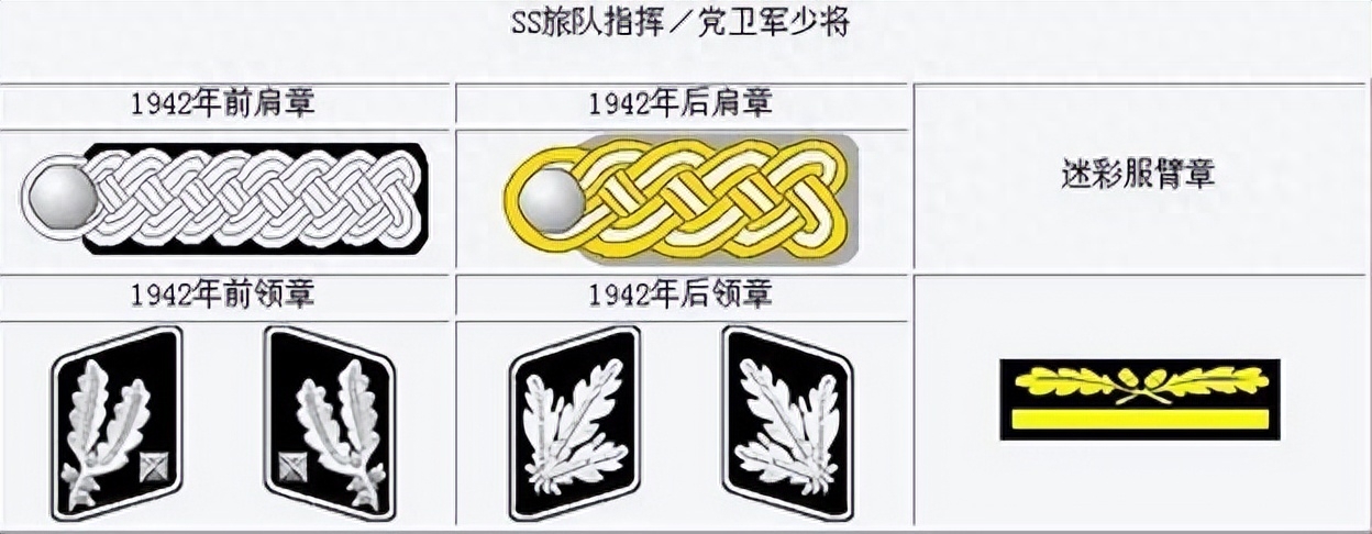 1942年党卫队对旗队长及以上军官的领章图案做了调整,橡叶图案由原来略带曲线的“写实”风格变为棱角分明的“扁平化”风格,将军级别也全部采用与国防军一样的金线编织大肩章。