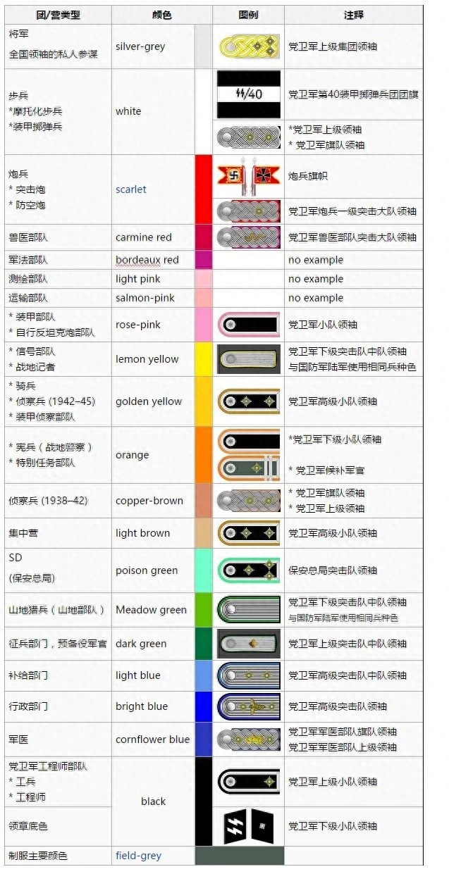 武装党卫军的兵种色体现在肩章以及大檐帽牙线上,领章只体现级别而不像国防军陆军领章只体现兵种。将军以上牙线为银色。