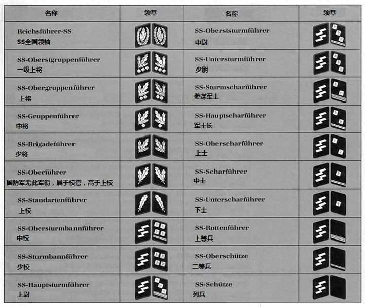 纳粹德国党卫军繁琐复杂的军衔,未必人人都能看明白,现在我们就来介绍一下德国党卫军(武装党卫队)的军衔。