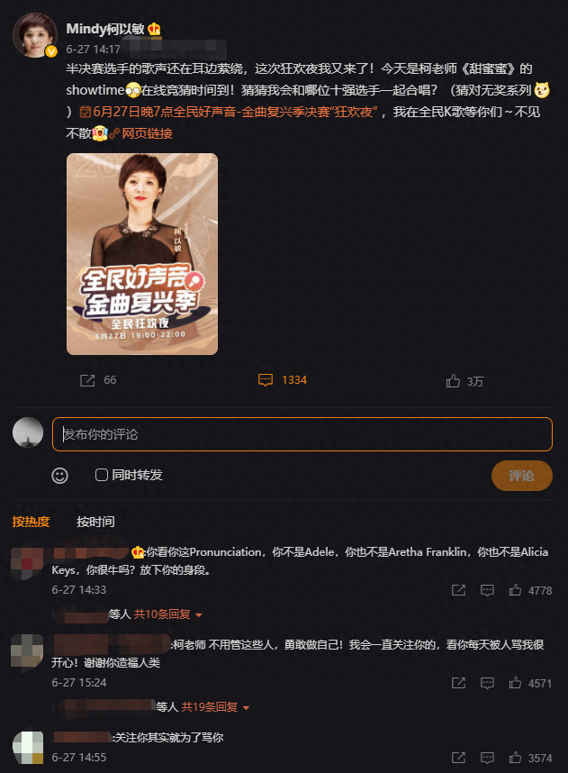 今年6月份,柯以敏在微博上发布了一条宣传,是她参加全民好声音的。但却没什么人买账,评论都是骂她的。