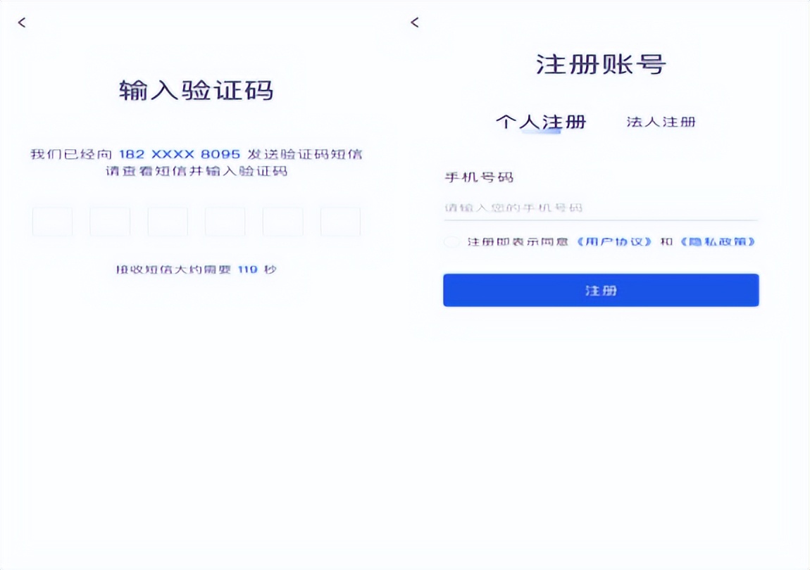②按要求输入真实、准确的个人信息,输入手机号码后点击“获取验证码”,输入收到的验证码后设置密码,点击“注册”,提示“注册成功”,即完成注册。