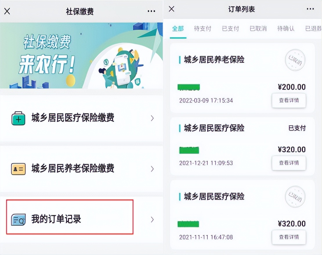 通过【本地优惠】-【城乡居民两险缴费】-【我的订单记录】,查询已生成的订单记录。输入待查缴费人身份证号码,点击“确认”进行查询,点击“查看详情”即可查看订单详情。