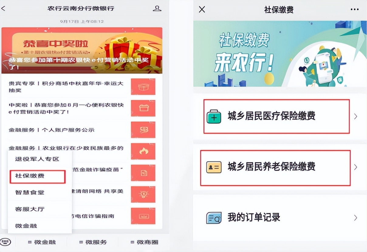 在公众号中,通过【农行云南分行微银行】-【微金融】-【社保缴费】进入,“选择险种(医疗保险/养老保险)进行缴费。