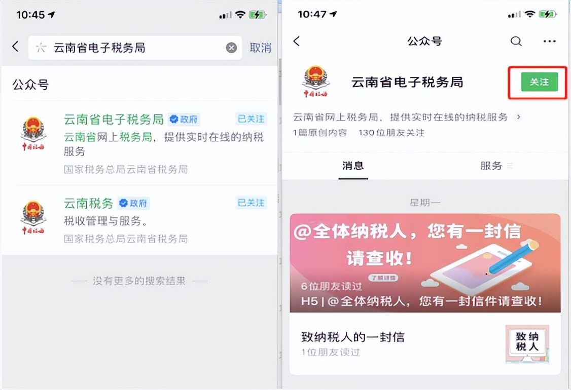 ①微信公众号。在微信搜索界面搜索“云南省电子税务局”找到并关注公众号。