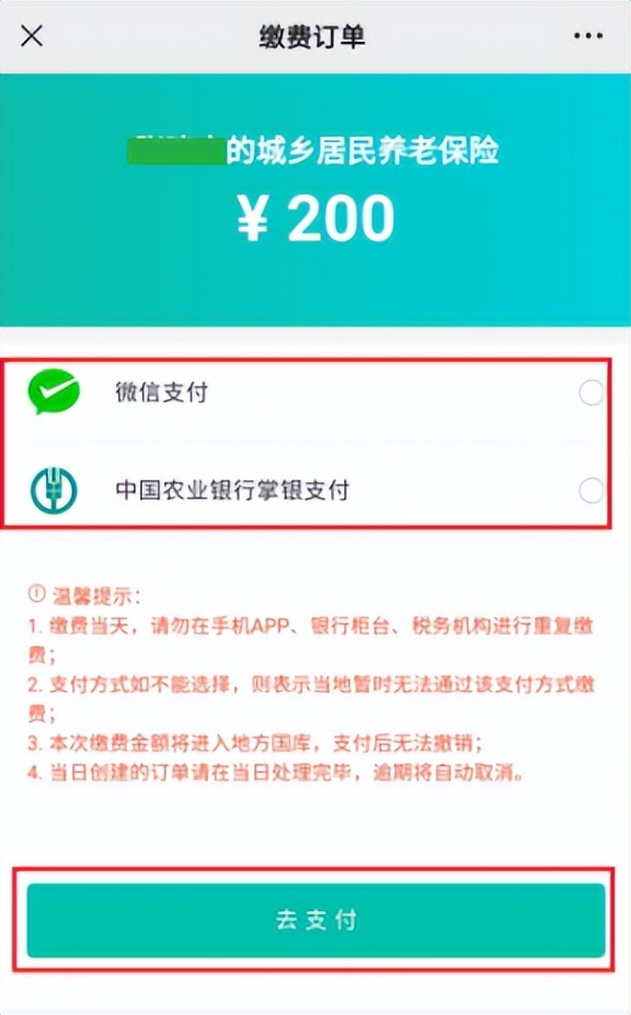 输入缴款人姓名、身份证号码,选择缴费险种、缴费类型、缴费年度、缴费金额等信息,核实无误后点击“下一步”,提交订单选择支付方式,点击“去支付”,对订单进行缴费。缴款方式支持微信支付和中国农业银行掌银支付。